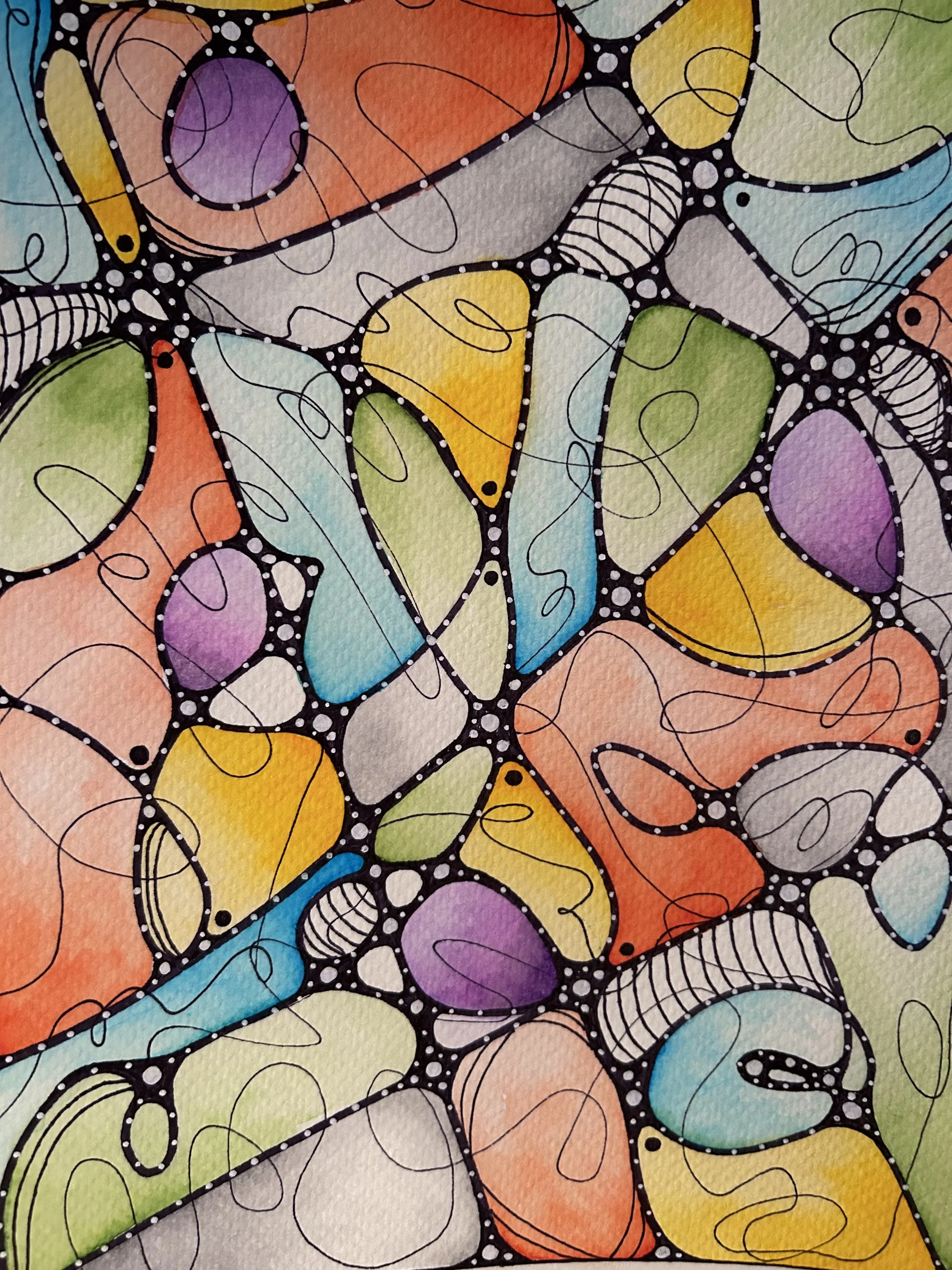 Don’t let this scientific name scare you! Neurographic Art is THE most fun that you can have with a Sharpie! You start by creating linework with your Sharpie, intersecting, looping, adding some shapes. By filling in the places where the lines intersect in a smooth and curvy way, your piece begins to take on a fluid and flowing look. Then you paint with watercolors in the shapes and areas that you’ve just created, topping it off with mark-making using acrylic markers, micron pens and gel pens. You are not drawing from external references, so you are freed up to let your line and mark-making just go where it wants to go. Each piece is unique!